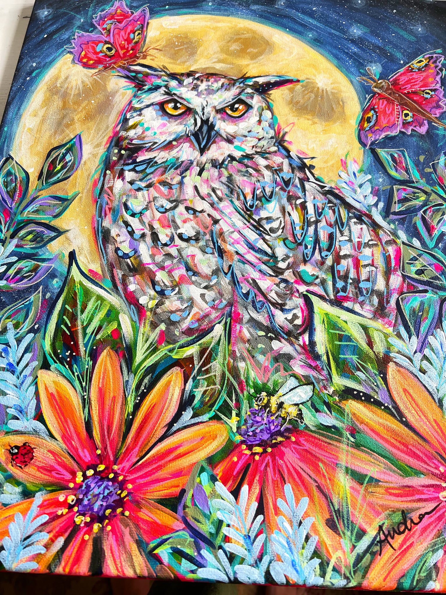 16x20 Original Owl Moon Butterfly Painting on Canvas