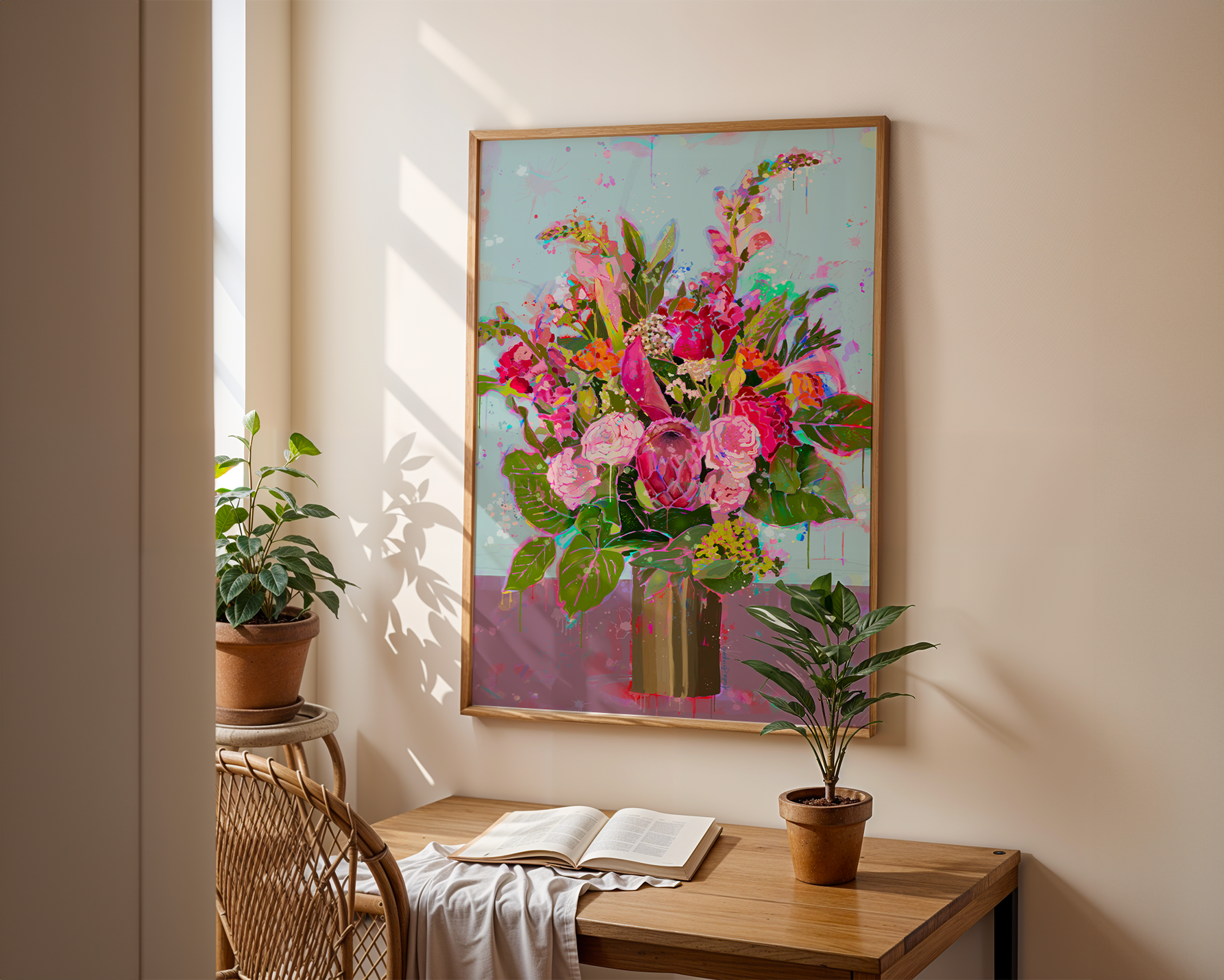 Brass Vase Colorful Floral Art Print on Paper or Canvas - Maximalist Home Decor, Colorful Poster