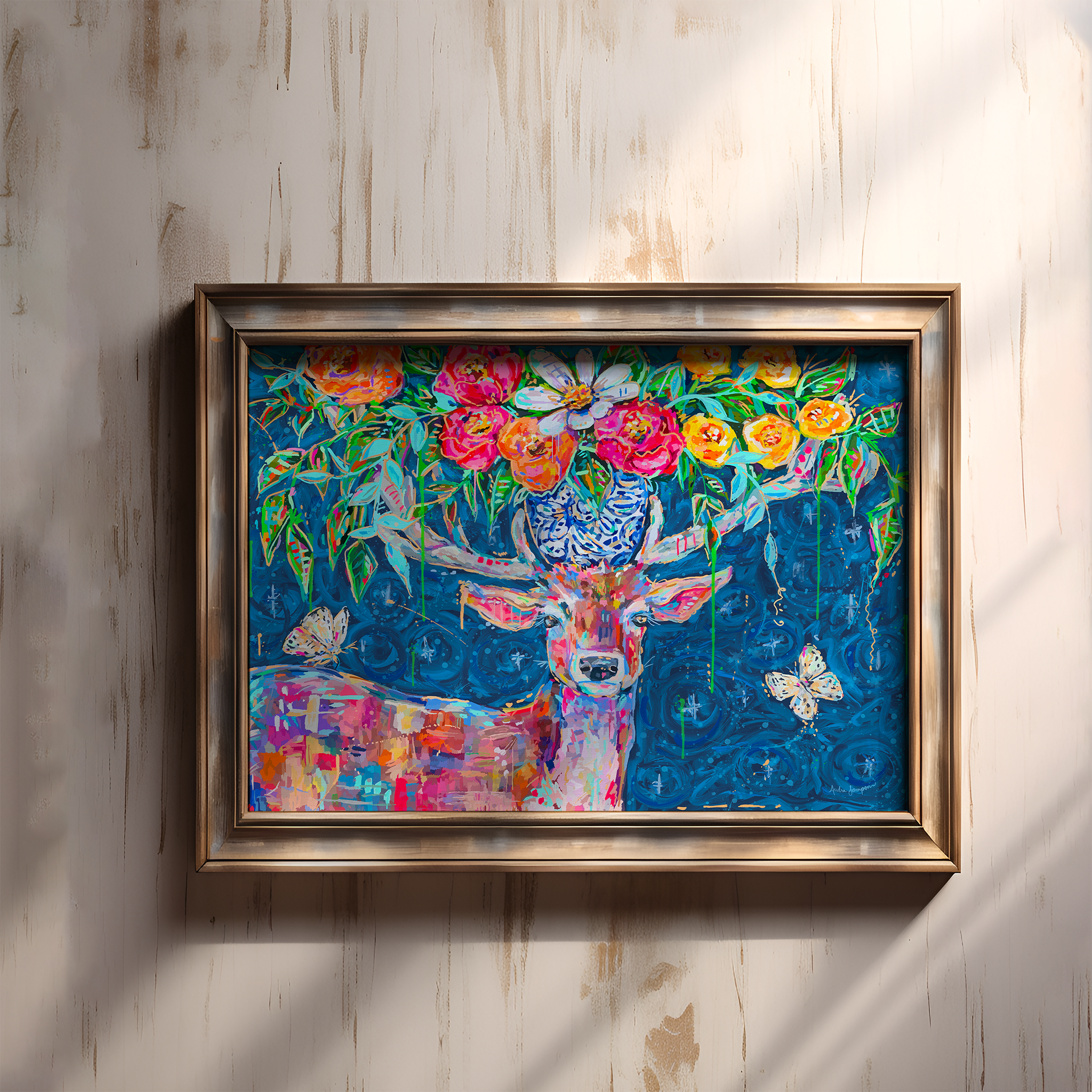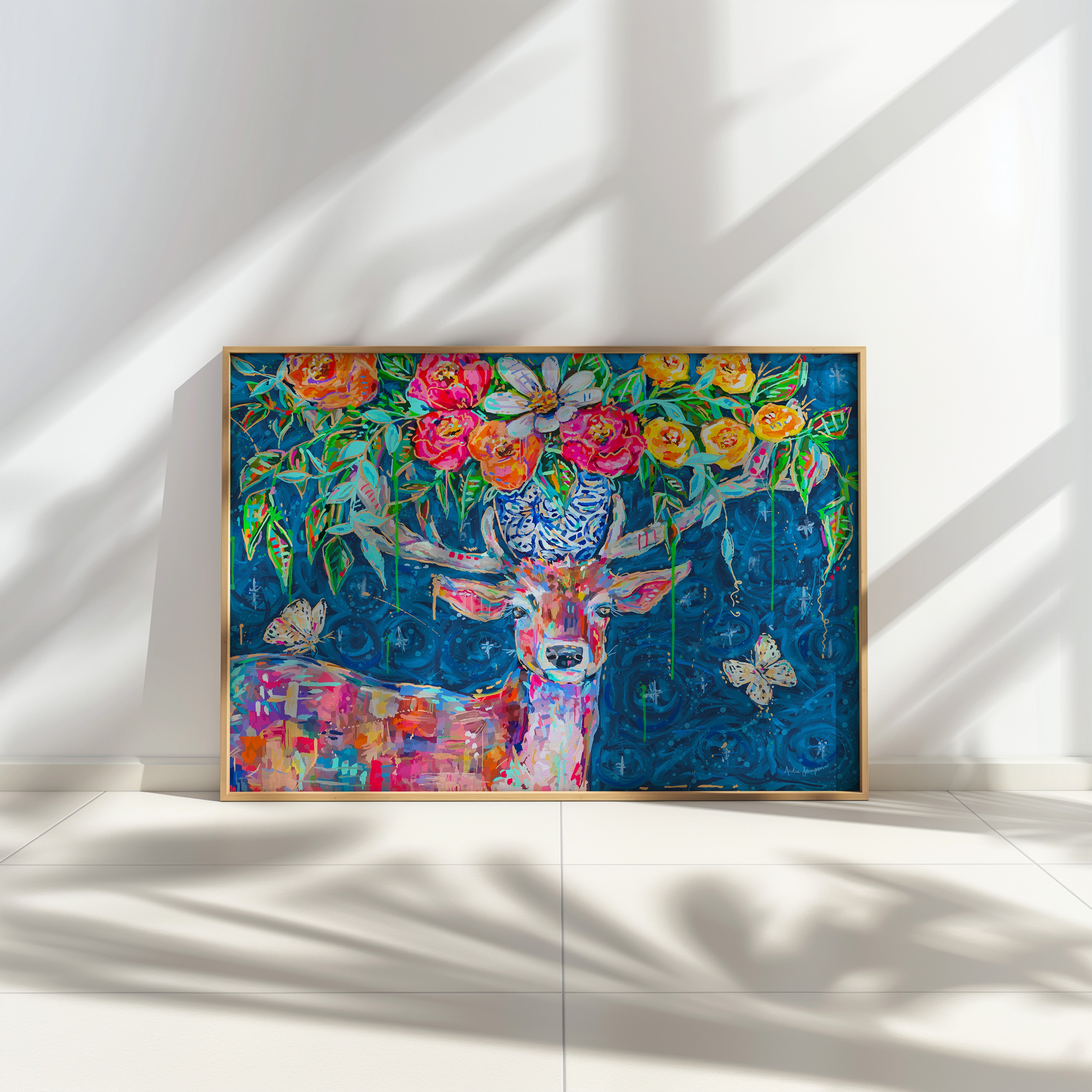Starry Night Deer Bouquet Art Print on Paper or Canvas - Blue and White Floral Decor, Maximalist Art Poster
