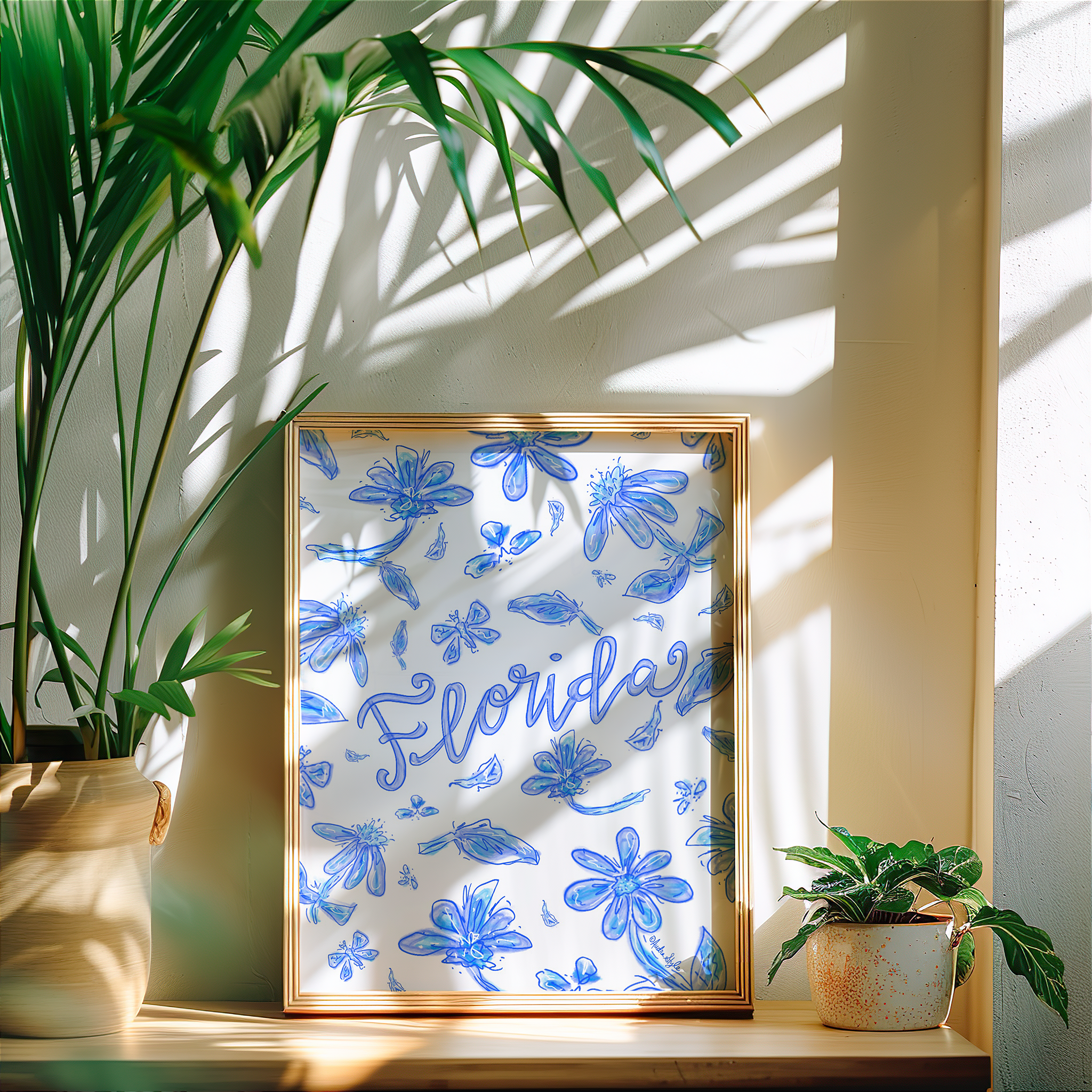 Florida Art Print on Paper or Canvas - State Pride, Hometown, Blue White Floral Wall Art Poster