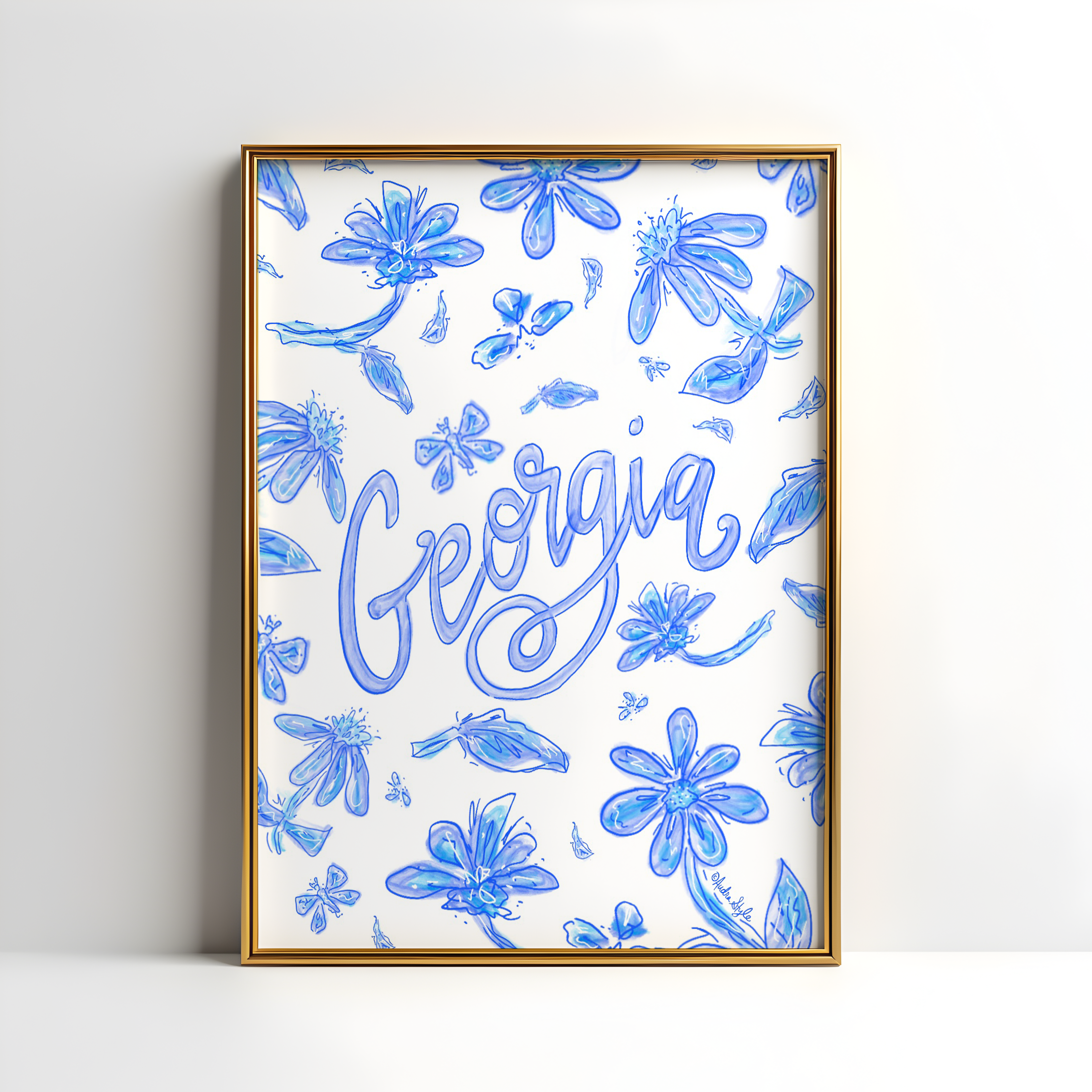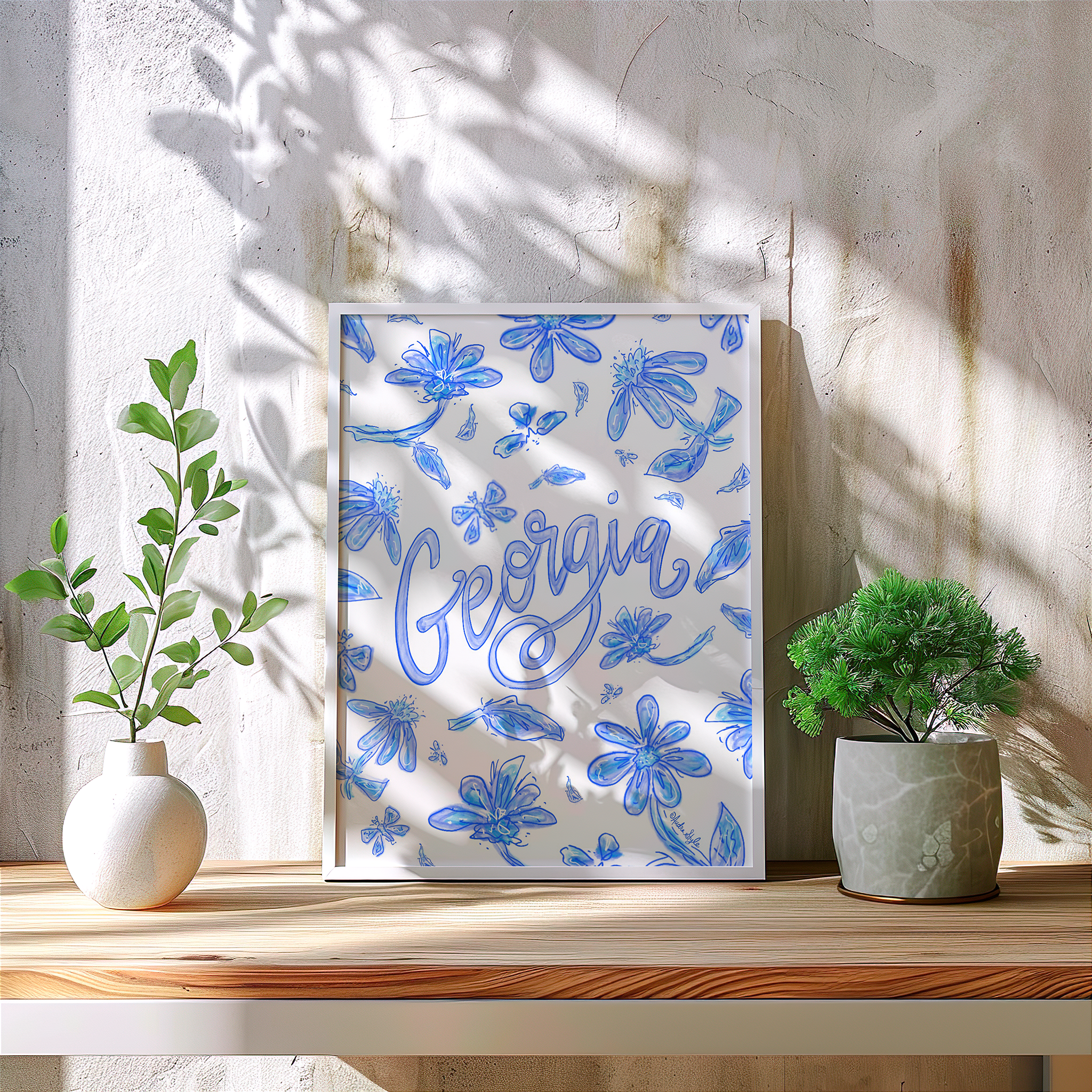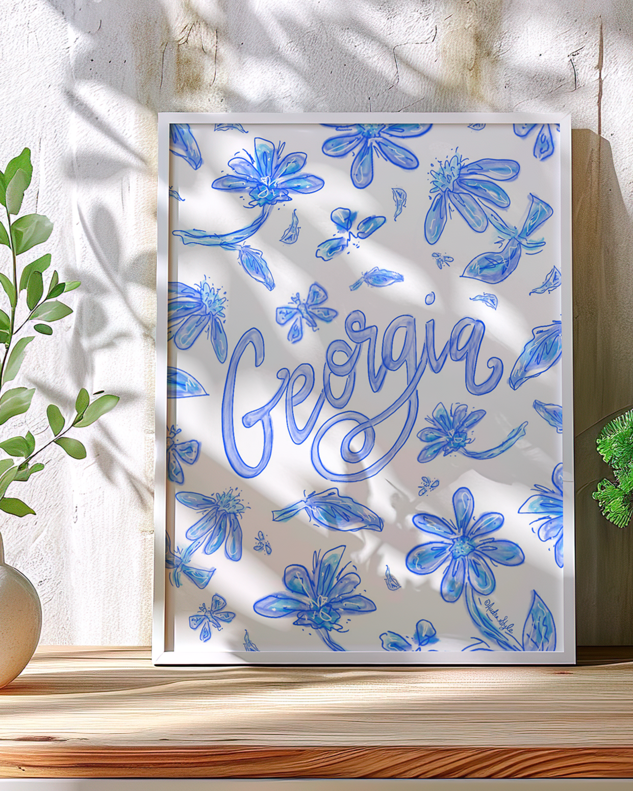 Georgia Art Print on Paper or Canvas - State Pride, Hometown, Blue White Floral Wall Art Poster
