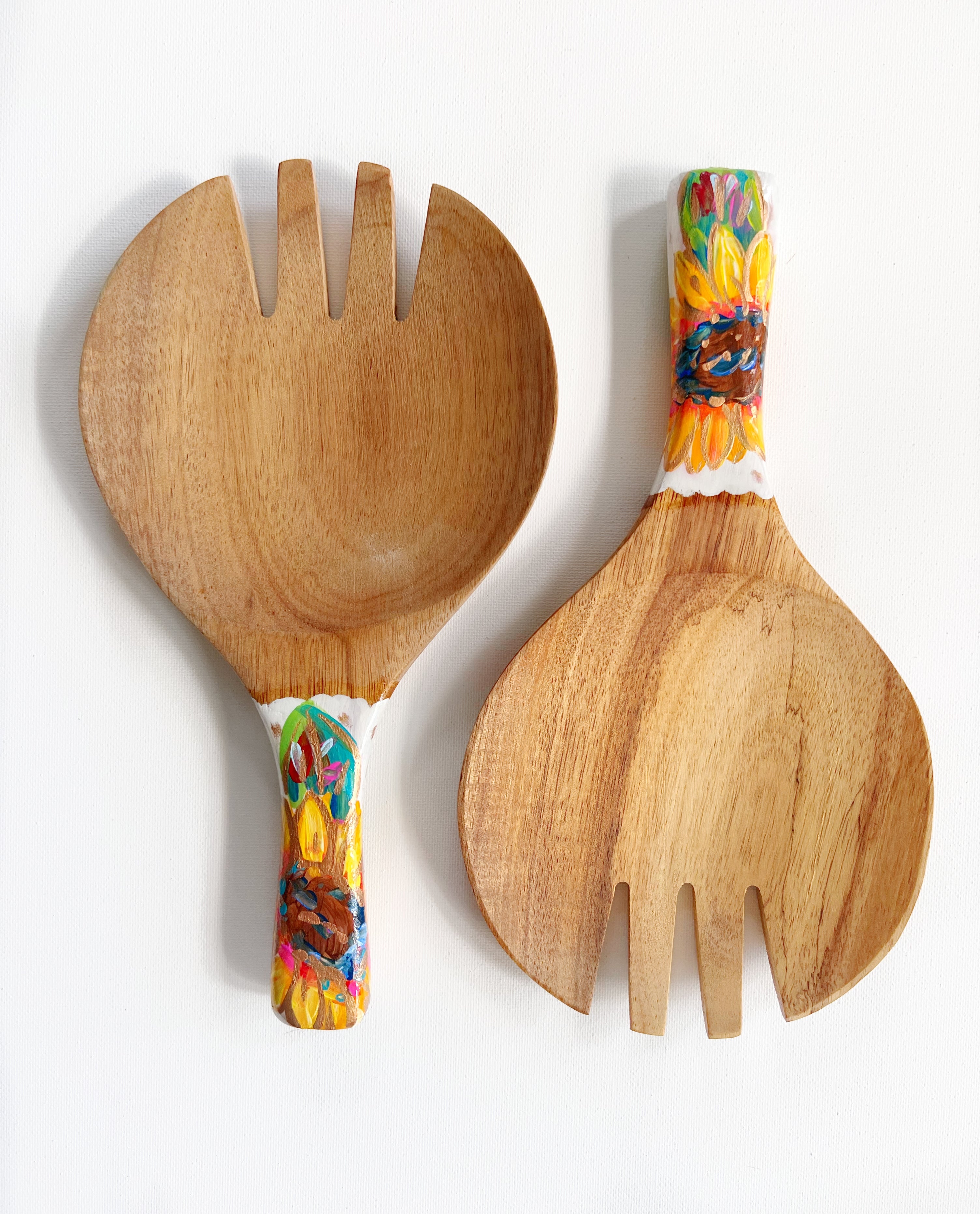 Hand-Painted Wooden Salad Tossers - Sunflowers