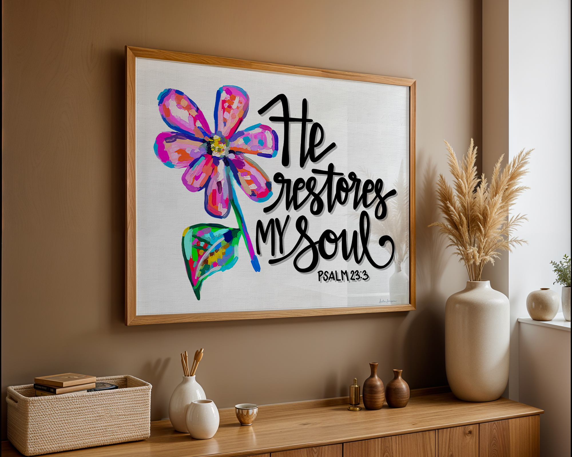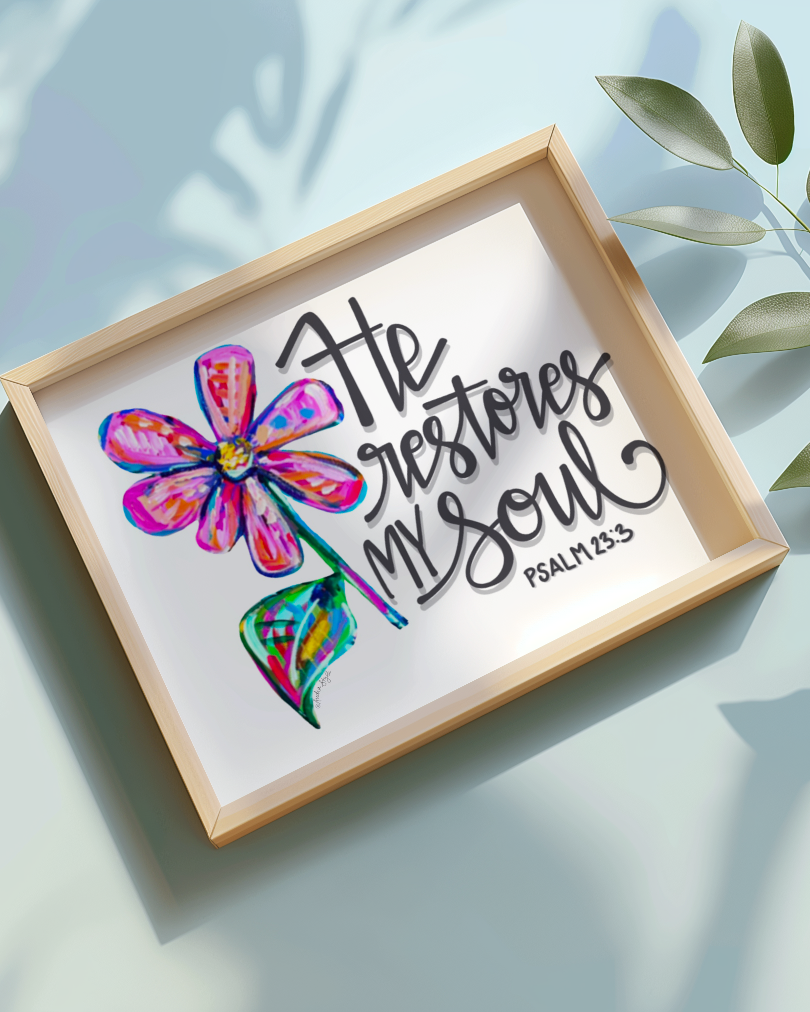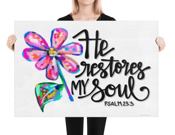 He Restores My Soul Art Print - Scripture Wall Art, Inspirational Decor, Colorful Floral Poster