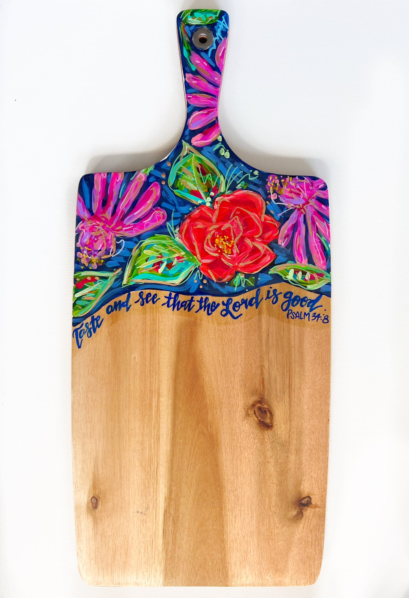 Hand-painted cutting board featuring a floral pattern and Psalms verse.