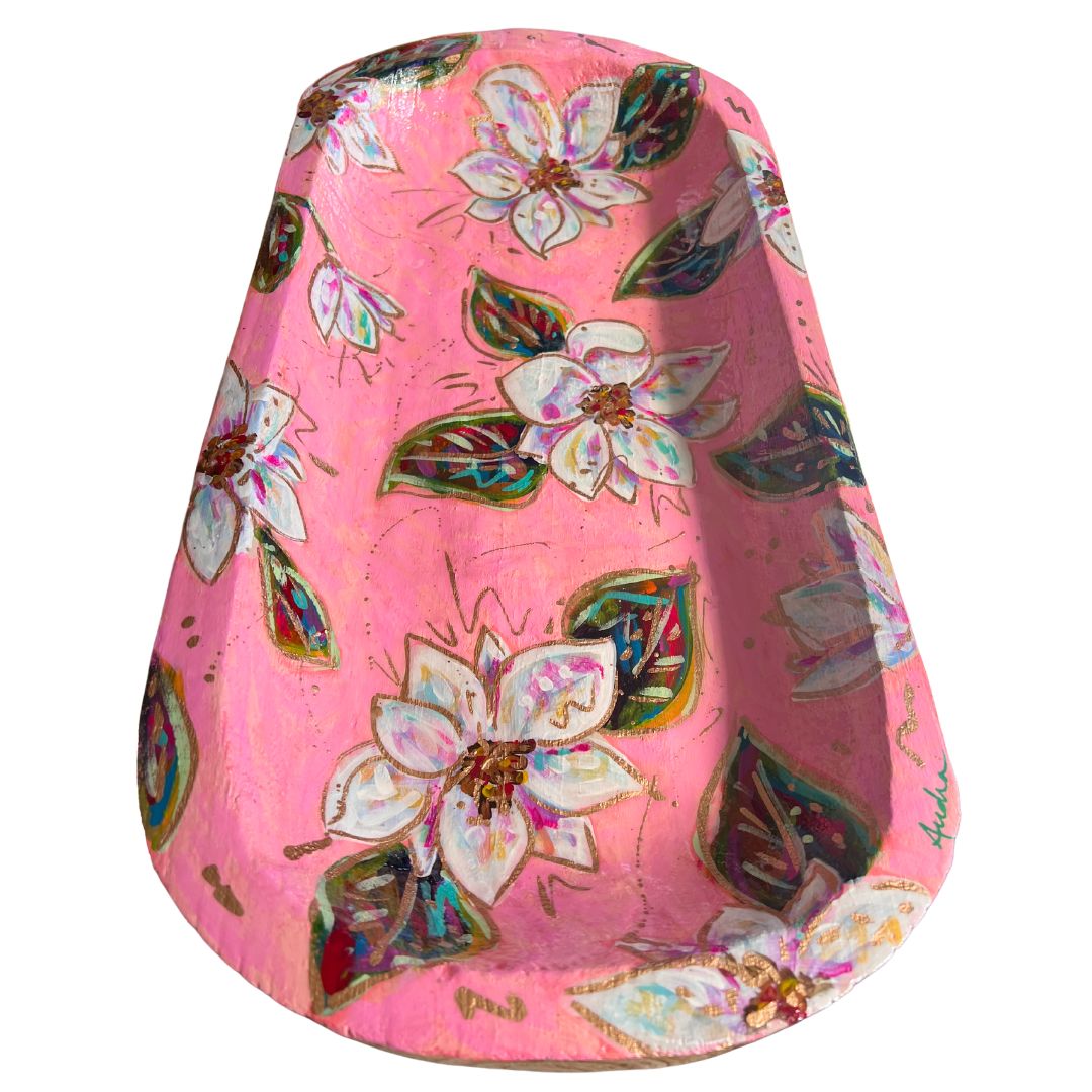 Hand-painted oval wooden bowl featuring magnolias in pinks, pastels and gold leaf.