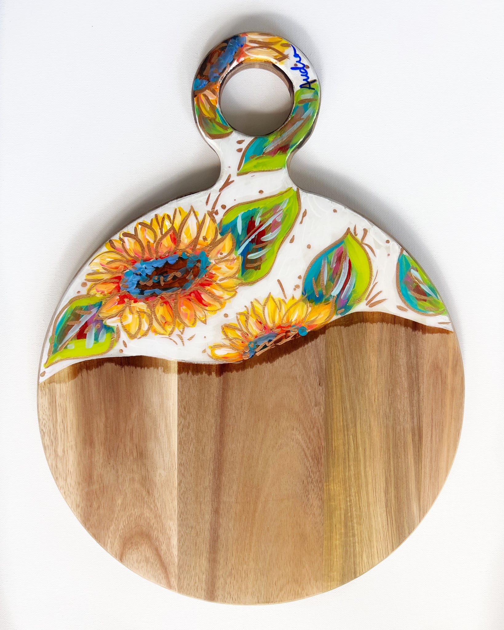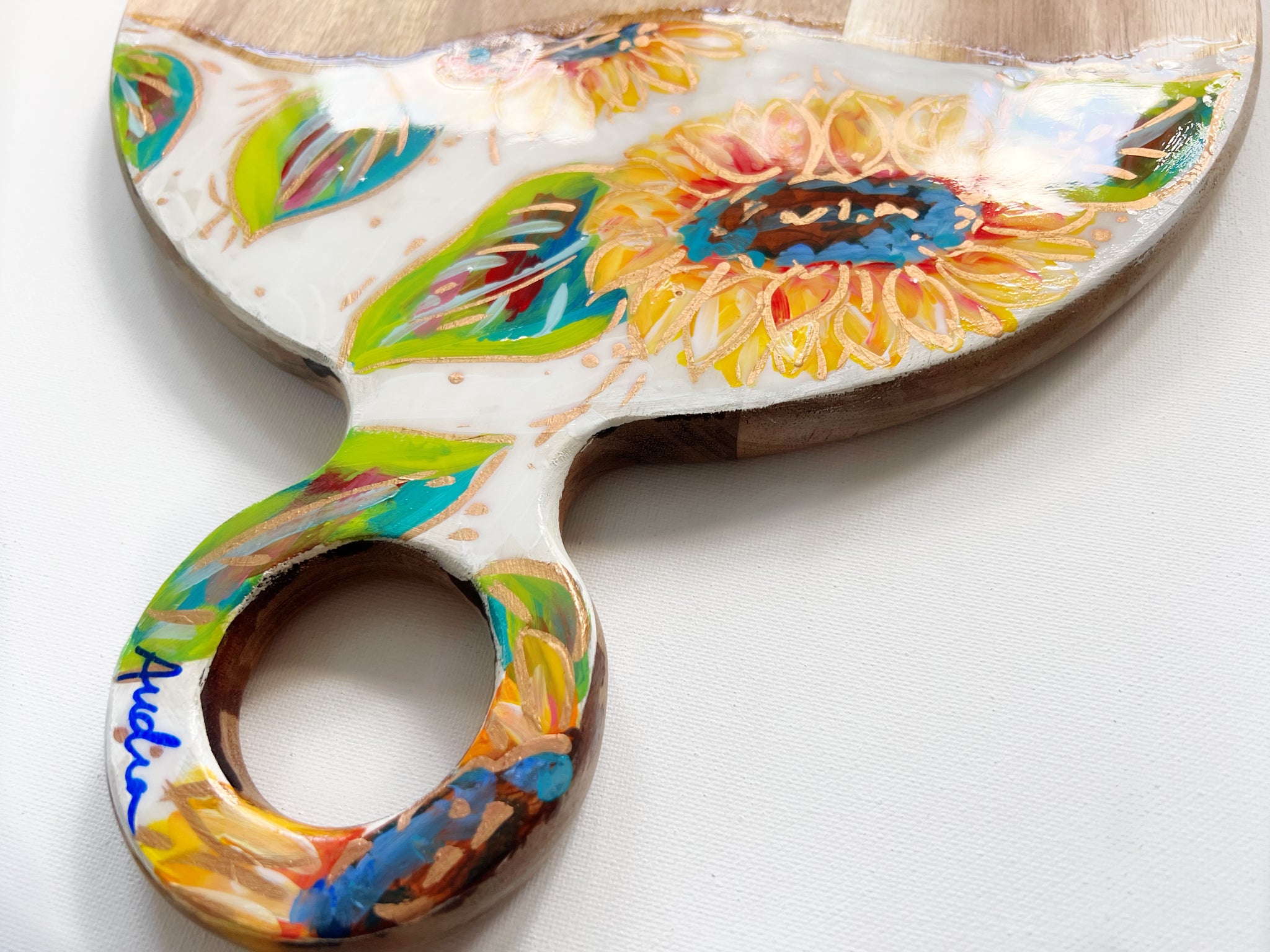 Hand-painted cutting board featuring my sunflowers and gold leaf.