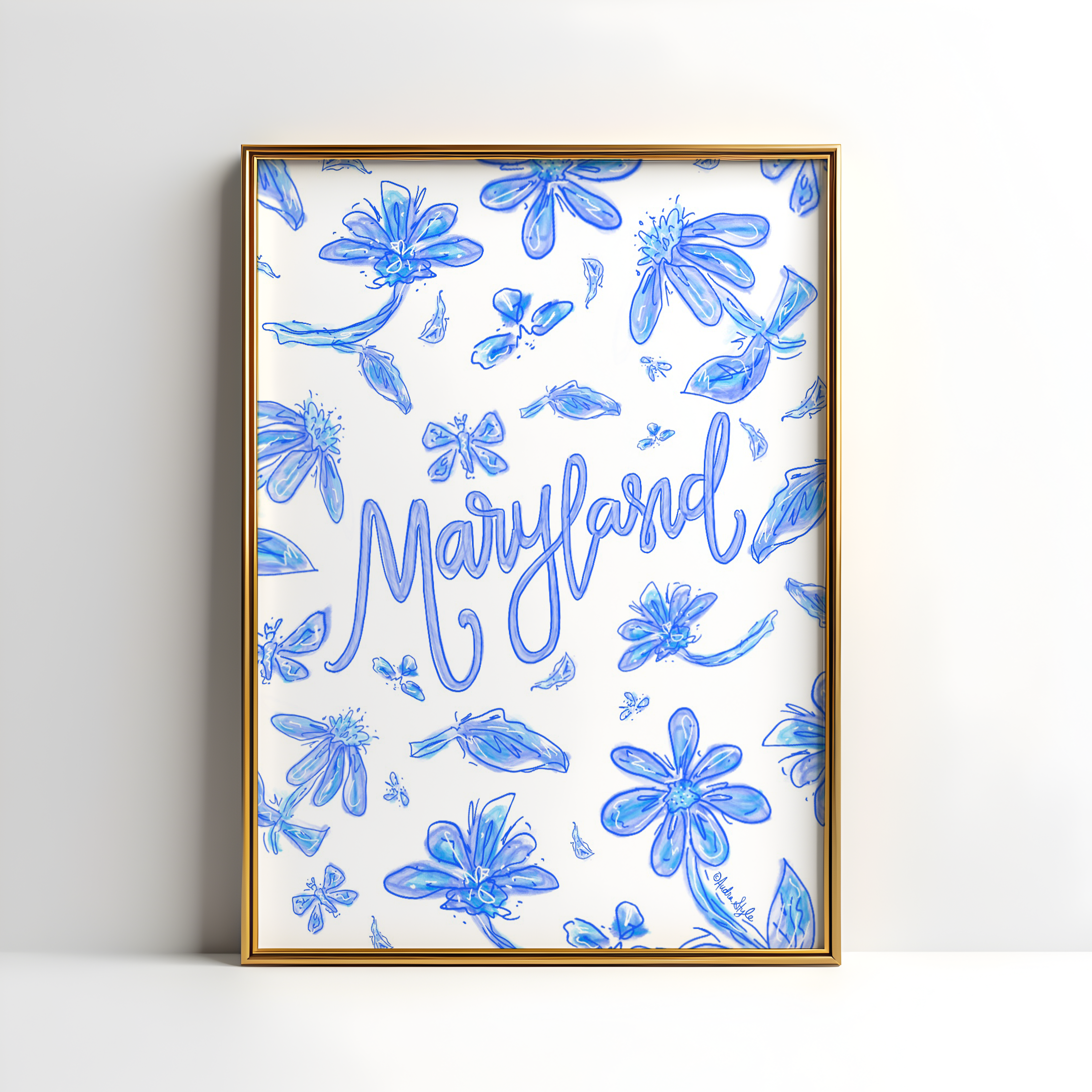 Maryland Art Print on Paper or Canvas - State Pride, Hometown, Blue White Floral Wall Art Poster