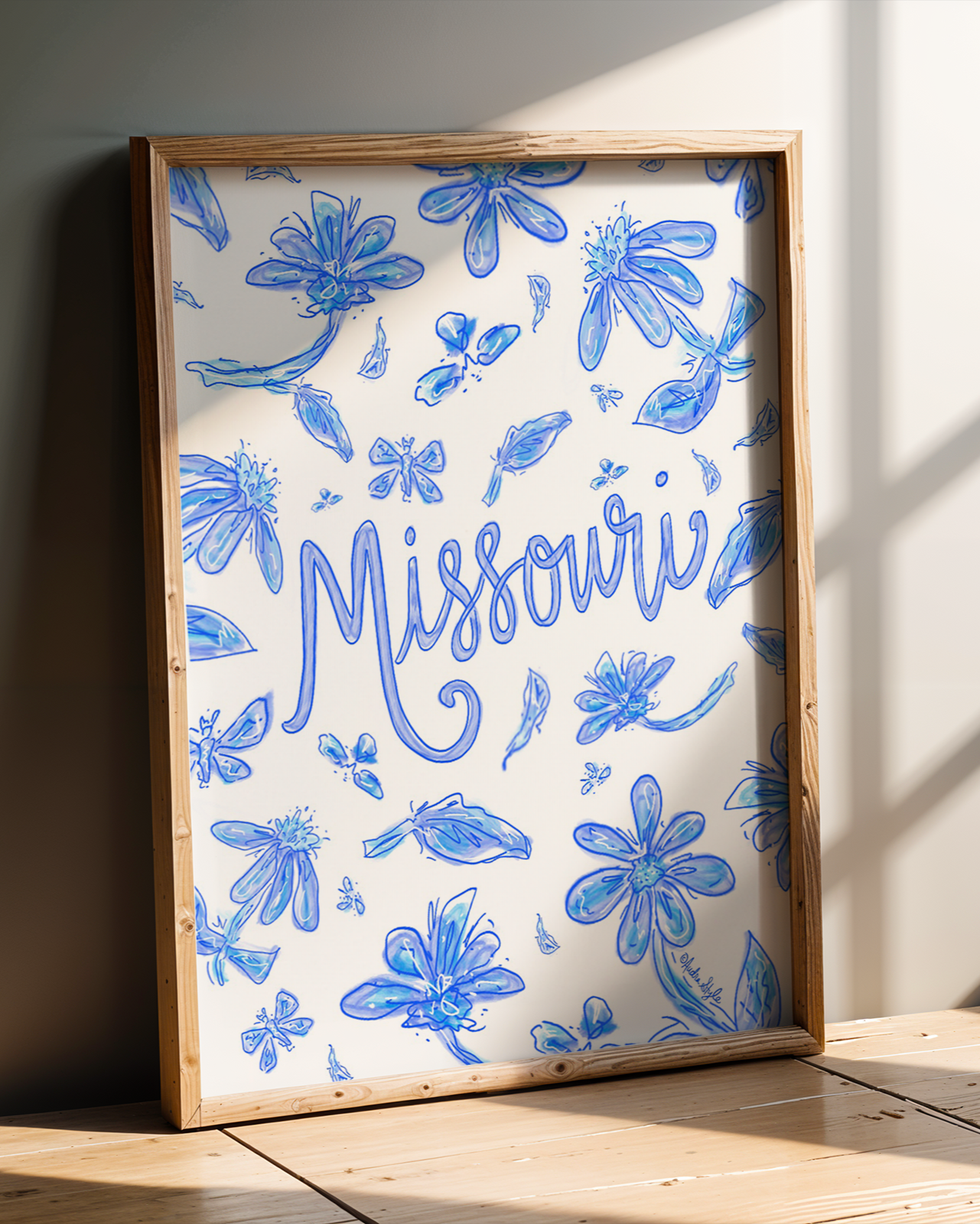 Missouri Art Print on Paper or Canvas - State Pride, Hometown, Blue White Floral Wall Art Poster