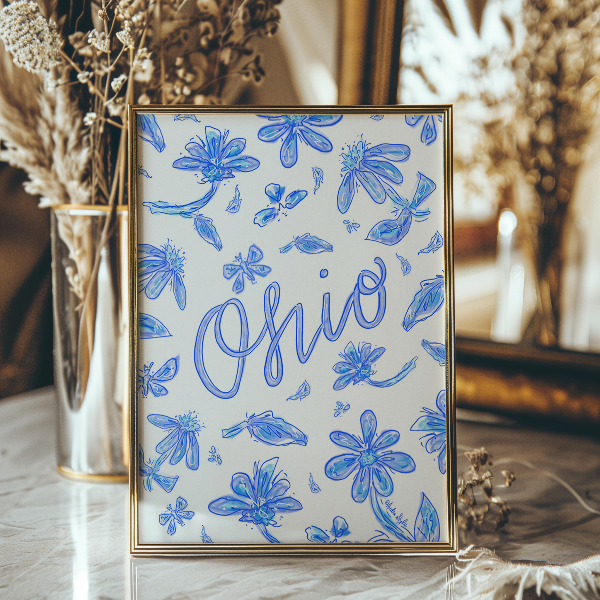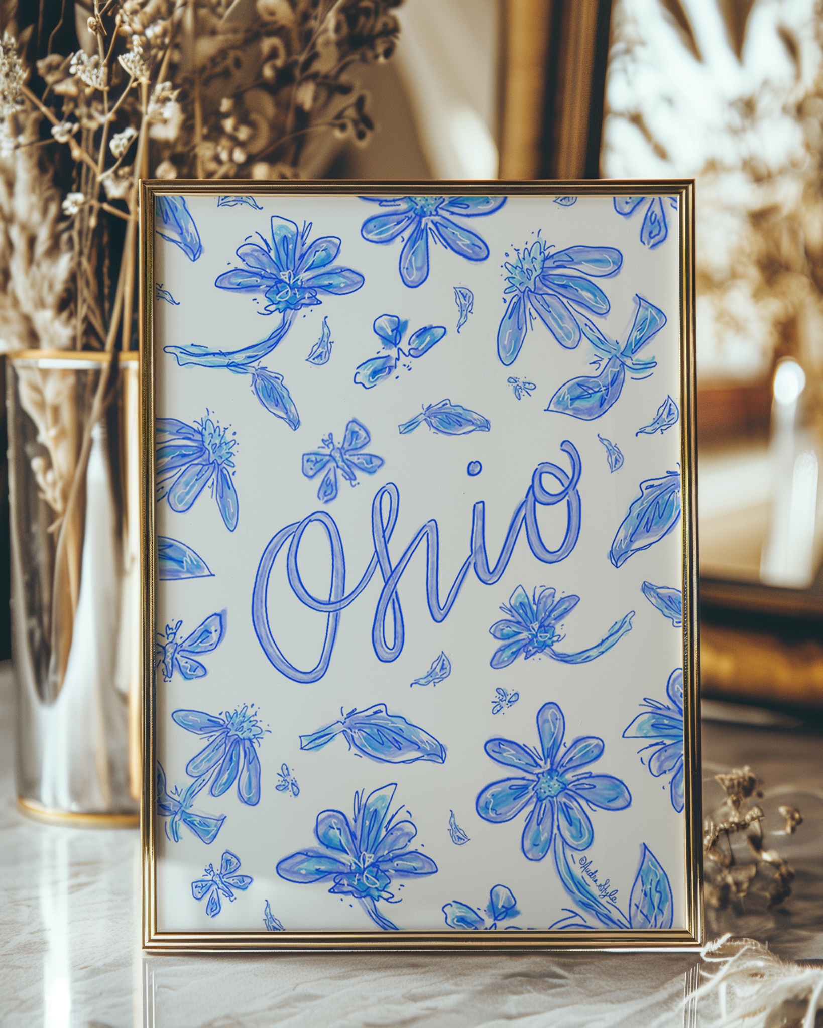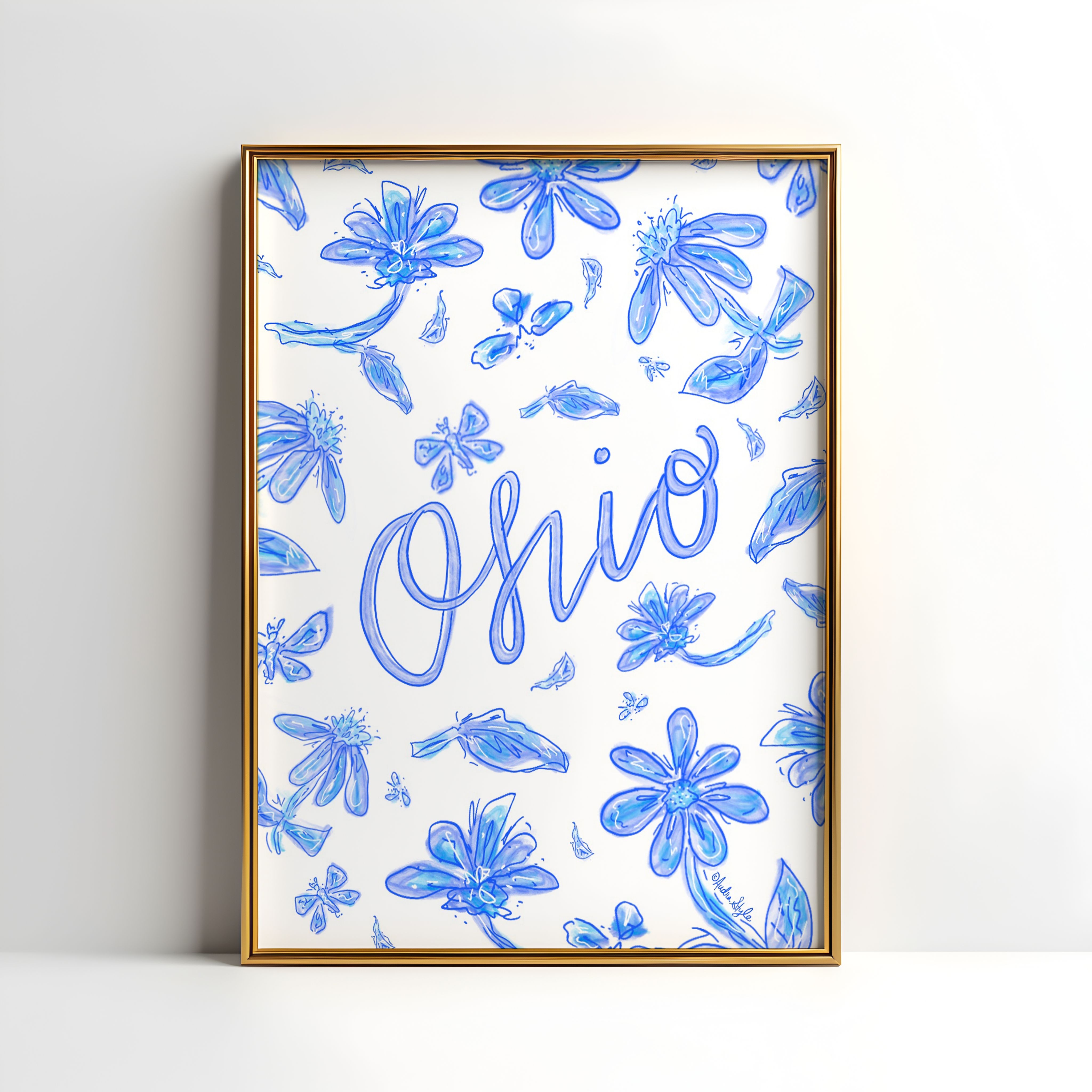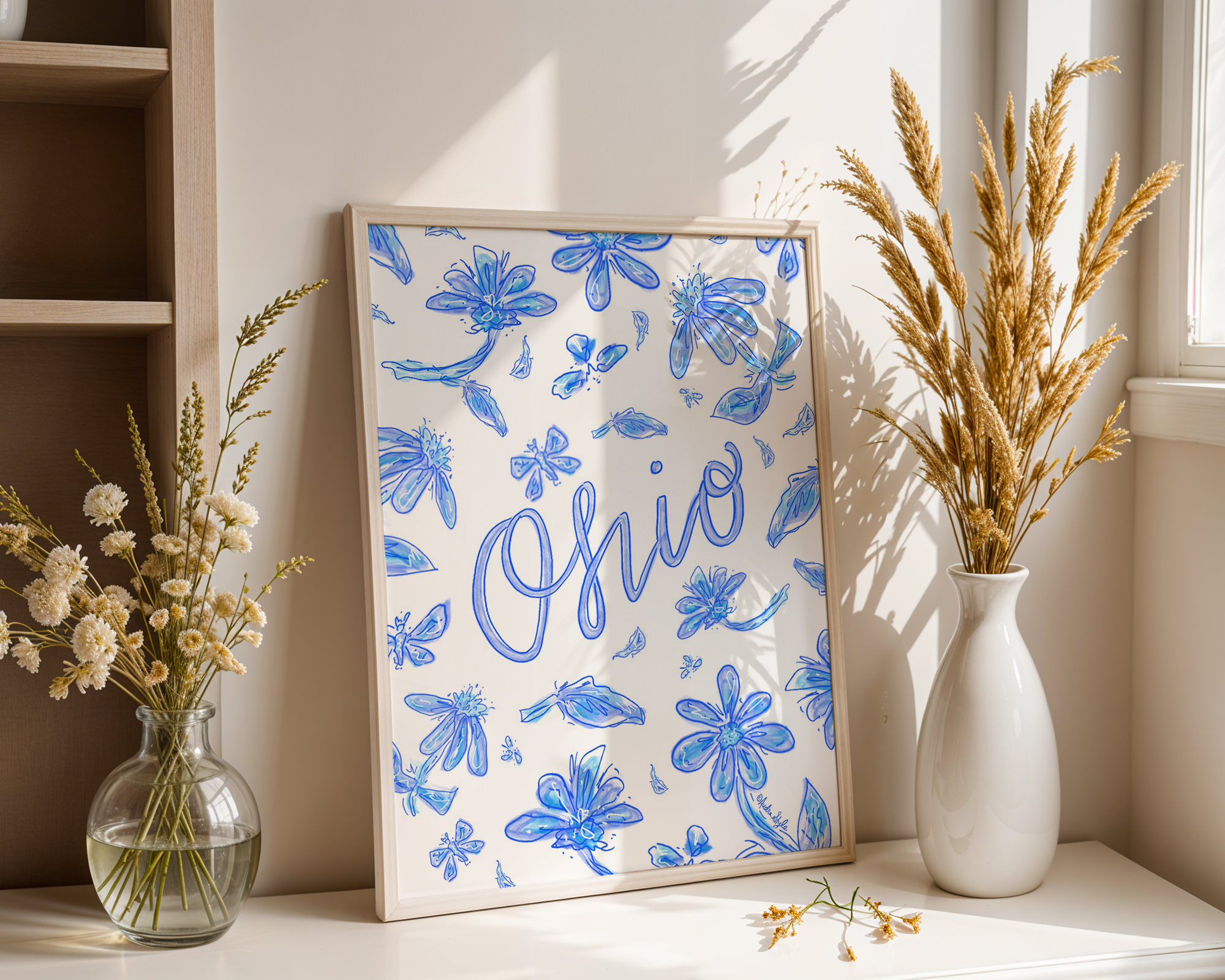 Ohio Art Print on Paper or Canvas - State Pride, Hometown, Blue White Floral Wall Art Poster
