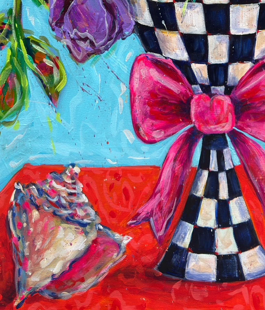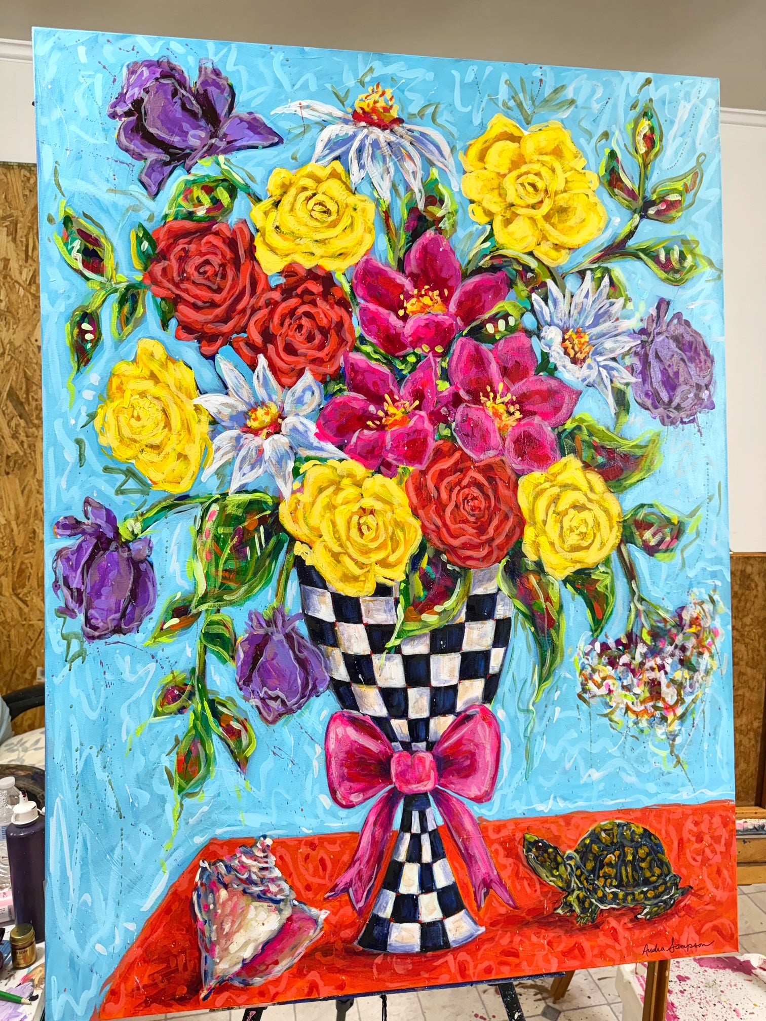 Original Conch and Turtle Floral Painting on 36"Wx48"T Canvas - Colorful Bouquet
