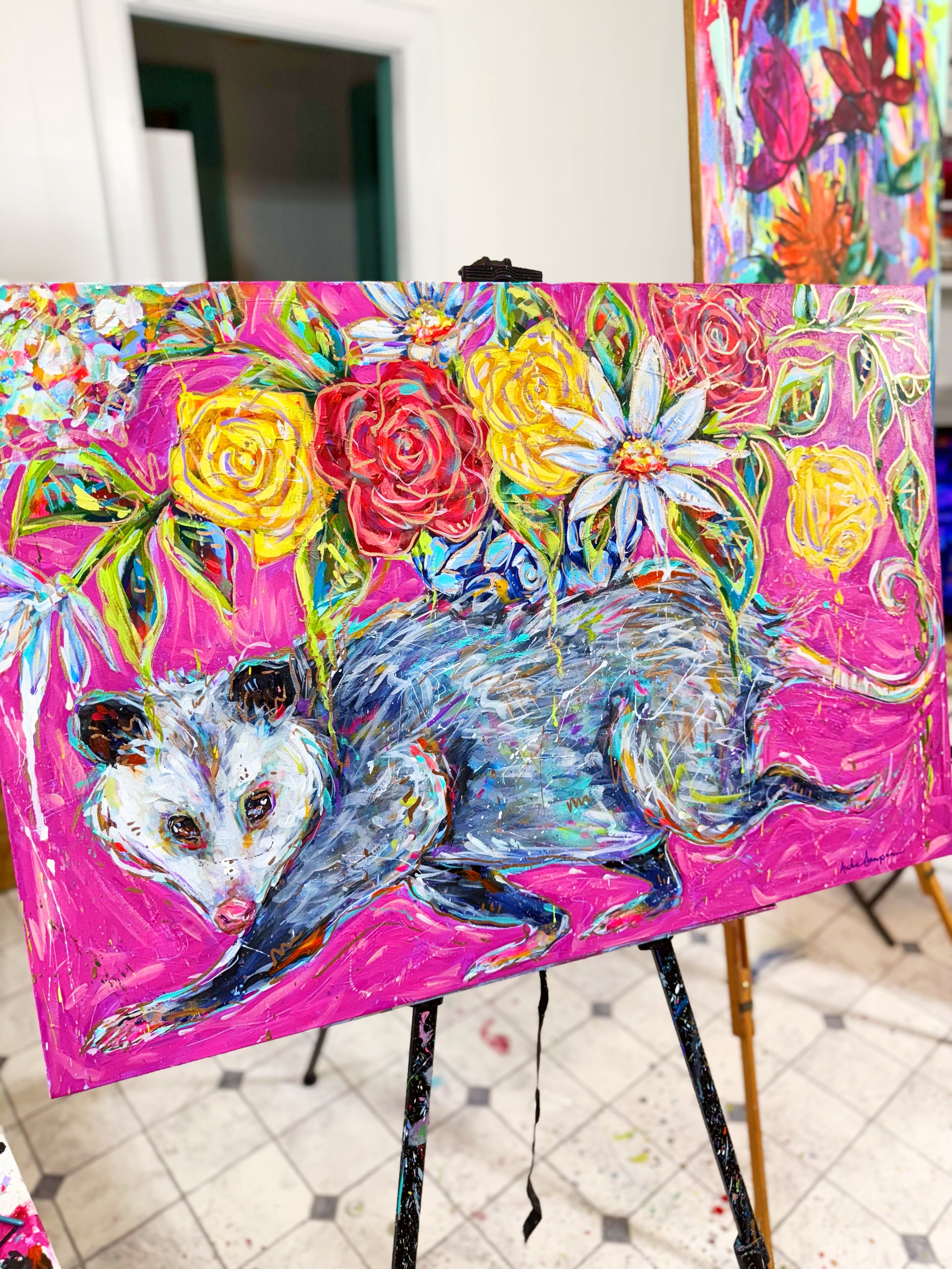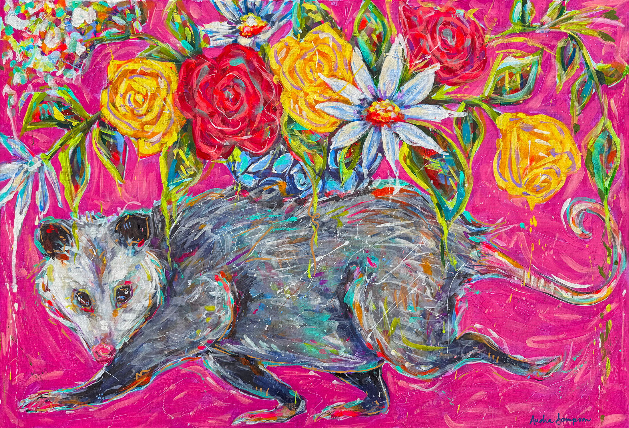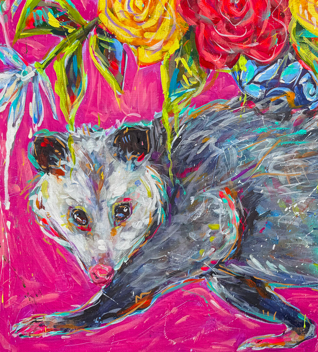 Original Possum and Flowers Painting on 36"Wx24"T Canvas - Animal and Bouquet