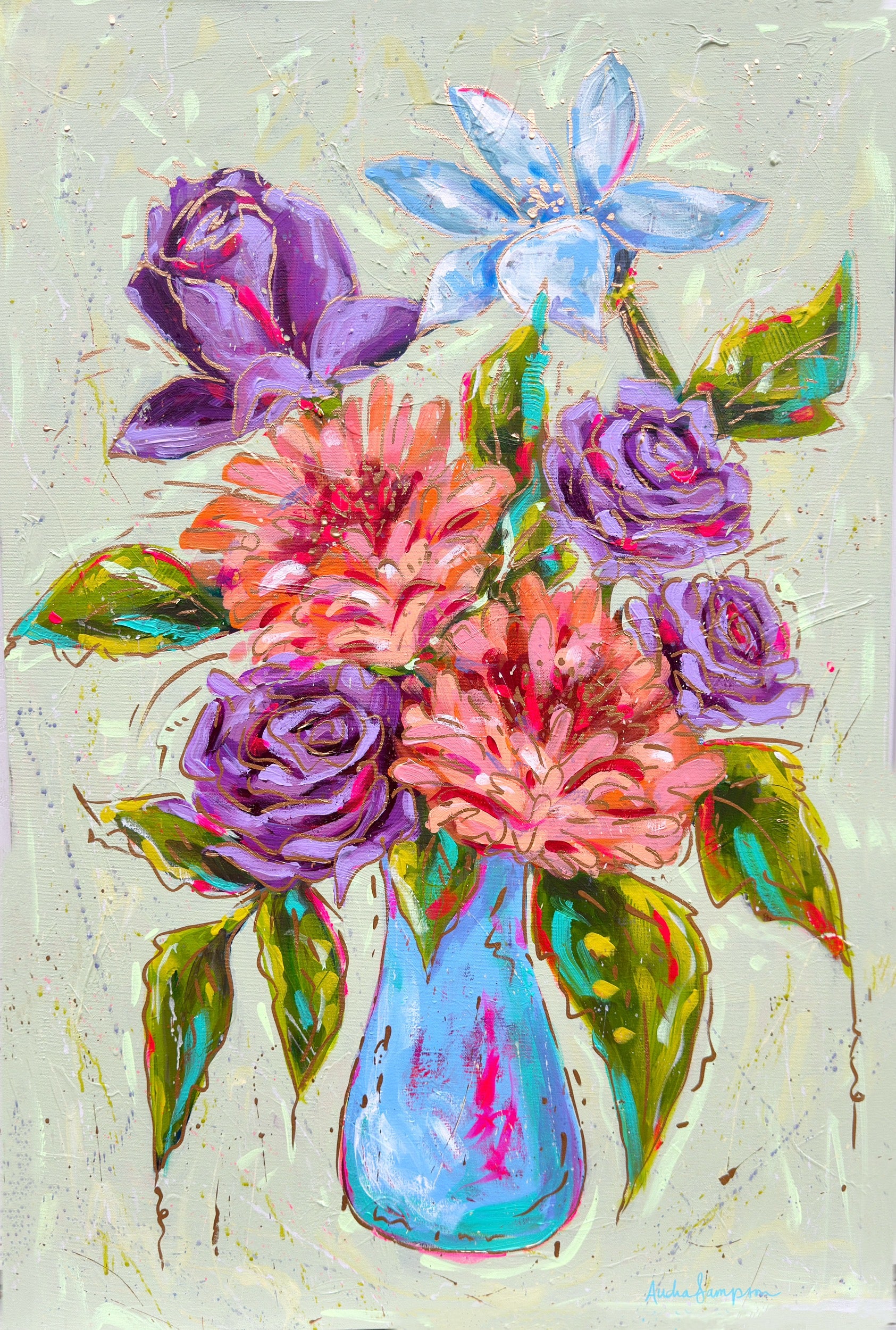 Original Purple Rose Floral Painting on 24"Wx36"T Canvas - Colorful Bouquet