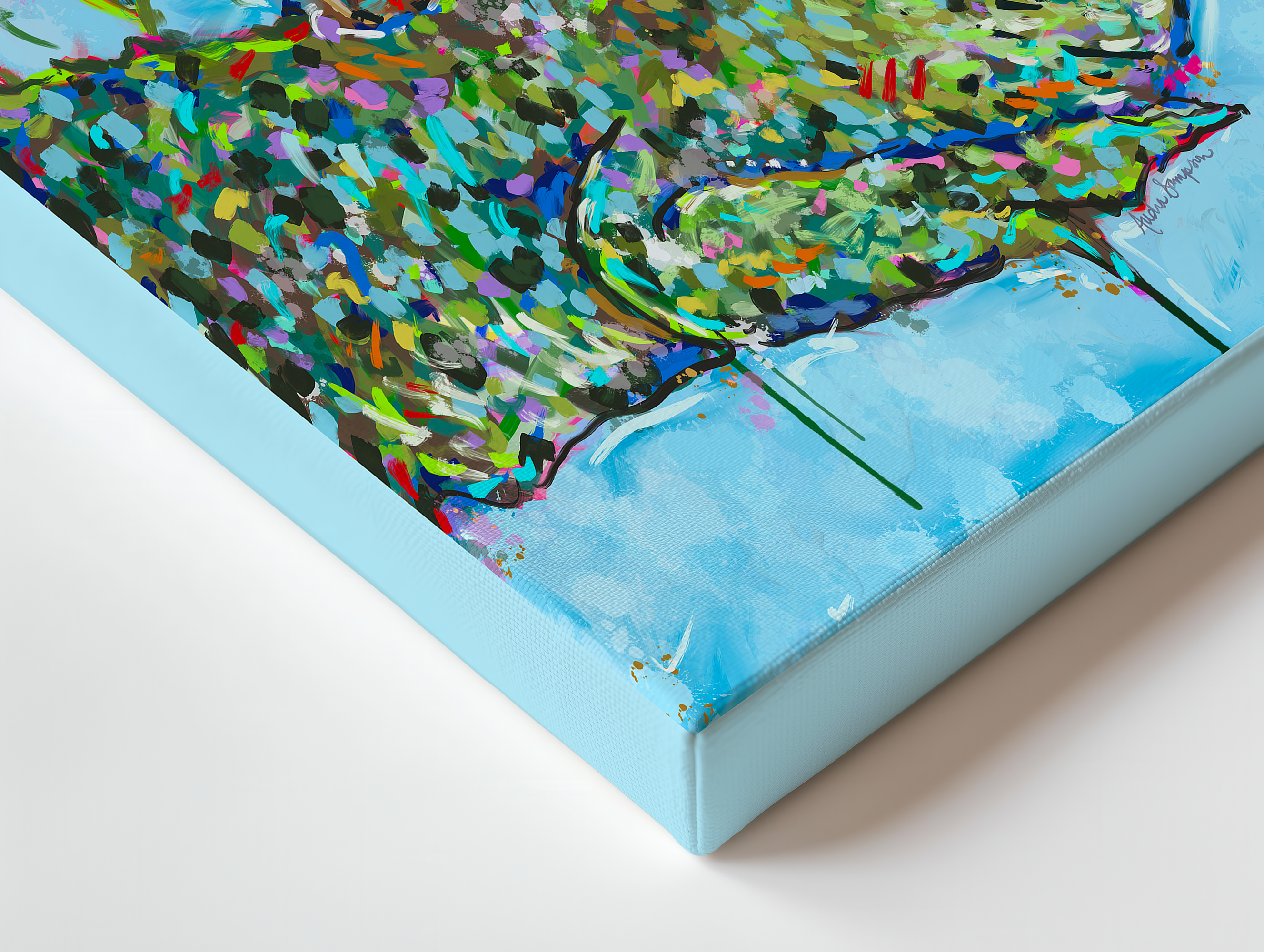 Smaller canvas prints are printed on stretched canvas with 3/4 edges finished in gold wash. Larger canvases are printed on a stretched canvas with 1 1/2-inch edges finished in a coordinating color.