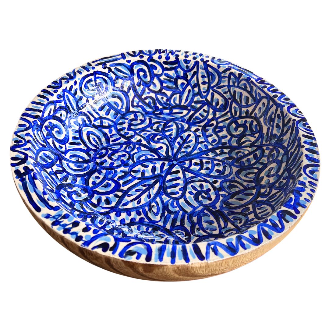 Hand-painted round wooden bowl featuring my blue and white floral pattern.