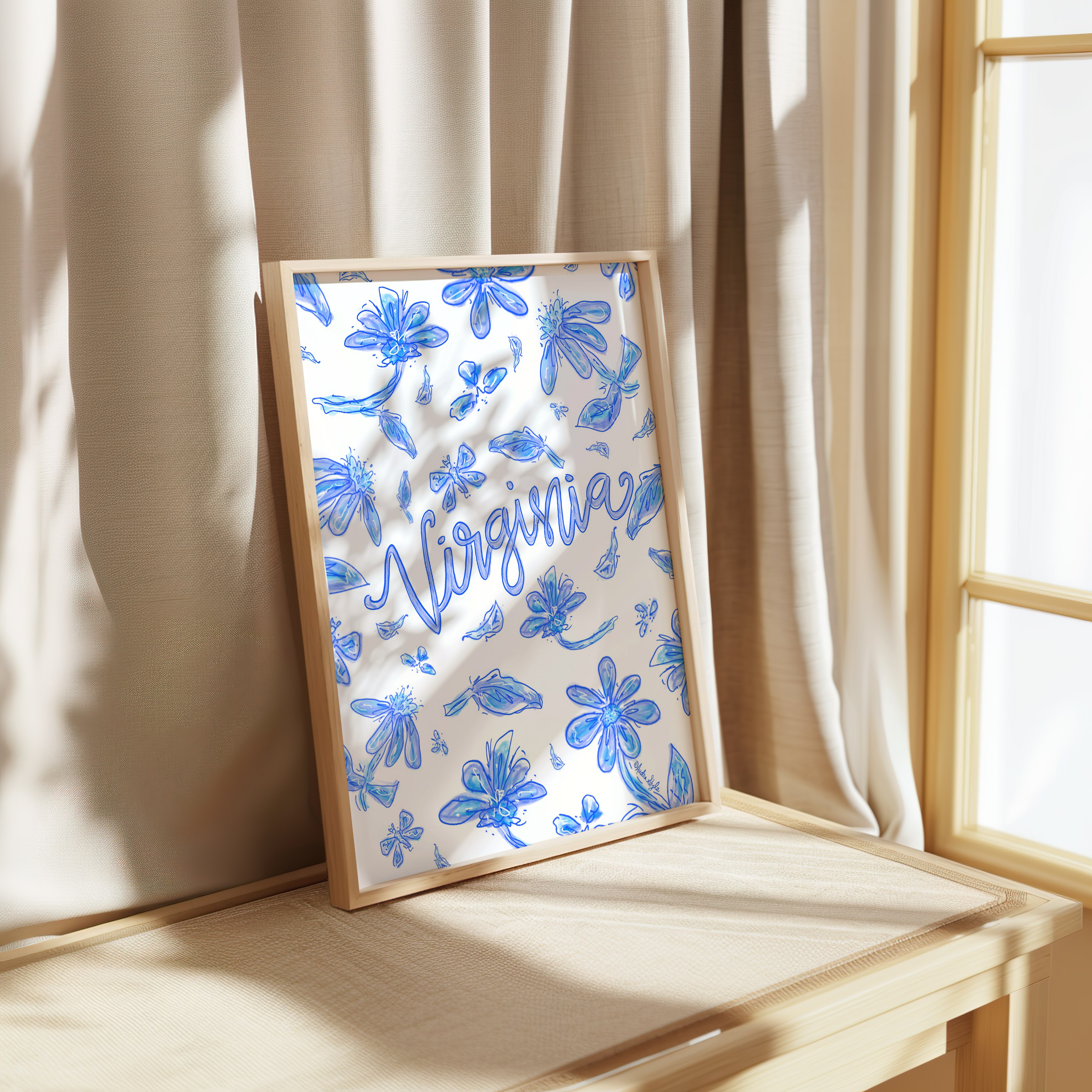 Virginia Art Print on Paper or Canvas - State Pride, Hometown, Blue White Floral Wall Art Poster